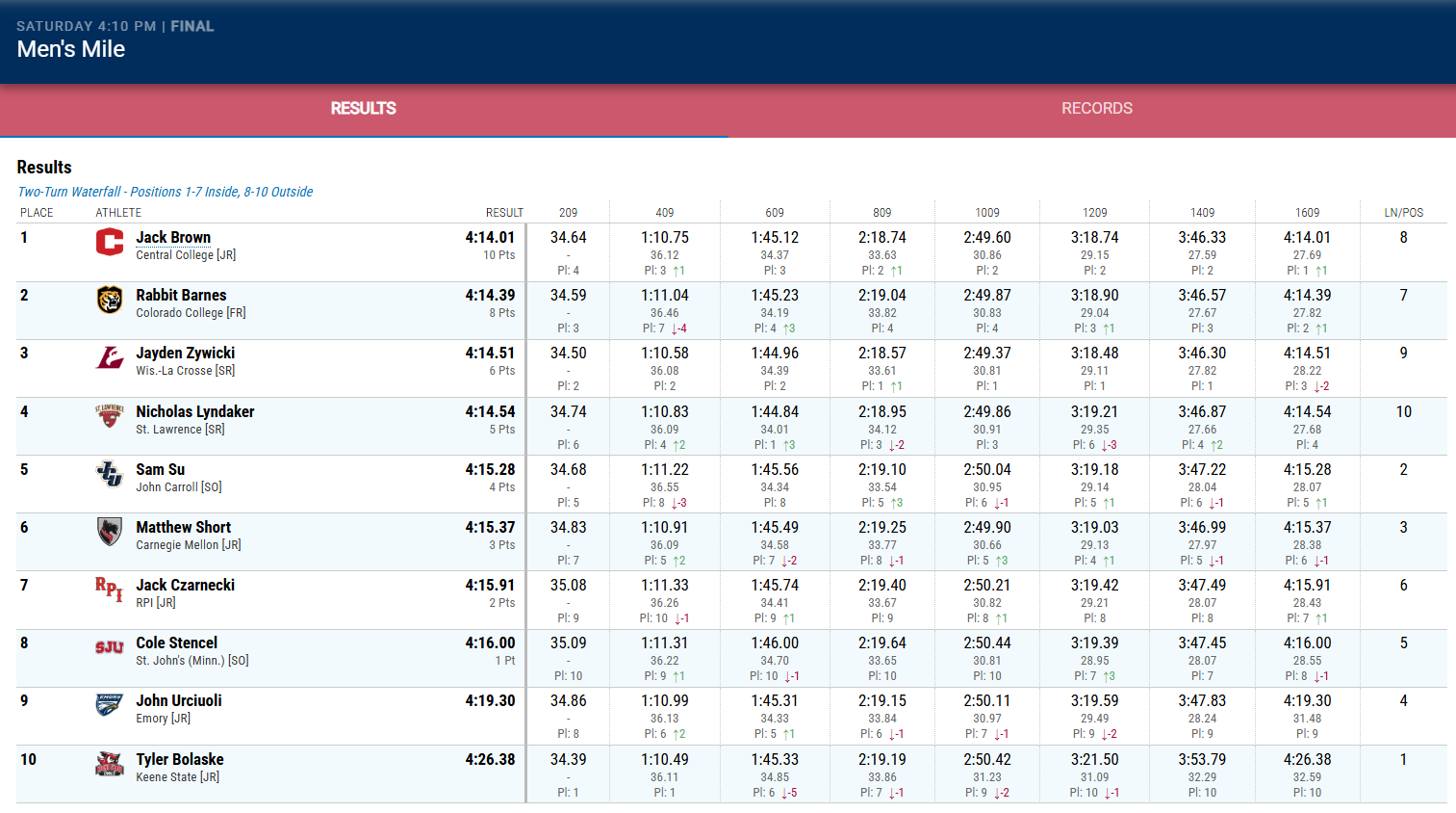 Finishing 8th, with 800m splits of 2:19.64 and 1:56.38 in the mile final on Saturday, Cole became our 6th indoor All-American in a distance event and first since Chris Erichsen in 2008! Obviously this was a great result that we were very excited about. Even for Cole to have made the final was a great result after coming in seeded 13th. This was Cole’s first track & field national meet and the first time he has ever even had to race a prelim / make a final now that the 1500m at the outdoor conference meet is just a two section final with no prelims anymore (since 2022). The race in the final certainly presented some tactical challenges when that many talented guys are bunched up together after getting out so slow, but that made for a great learning experience for Cole for the future and it’s hard to ask for much more than a 1:56.38 last 800m in the national final.